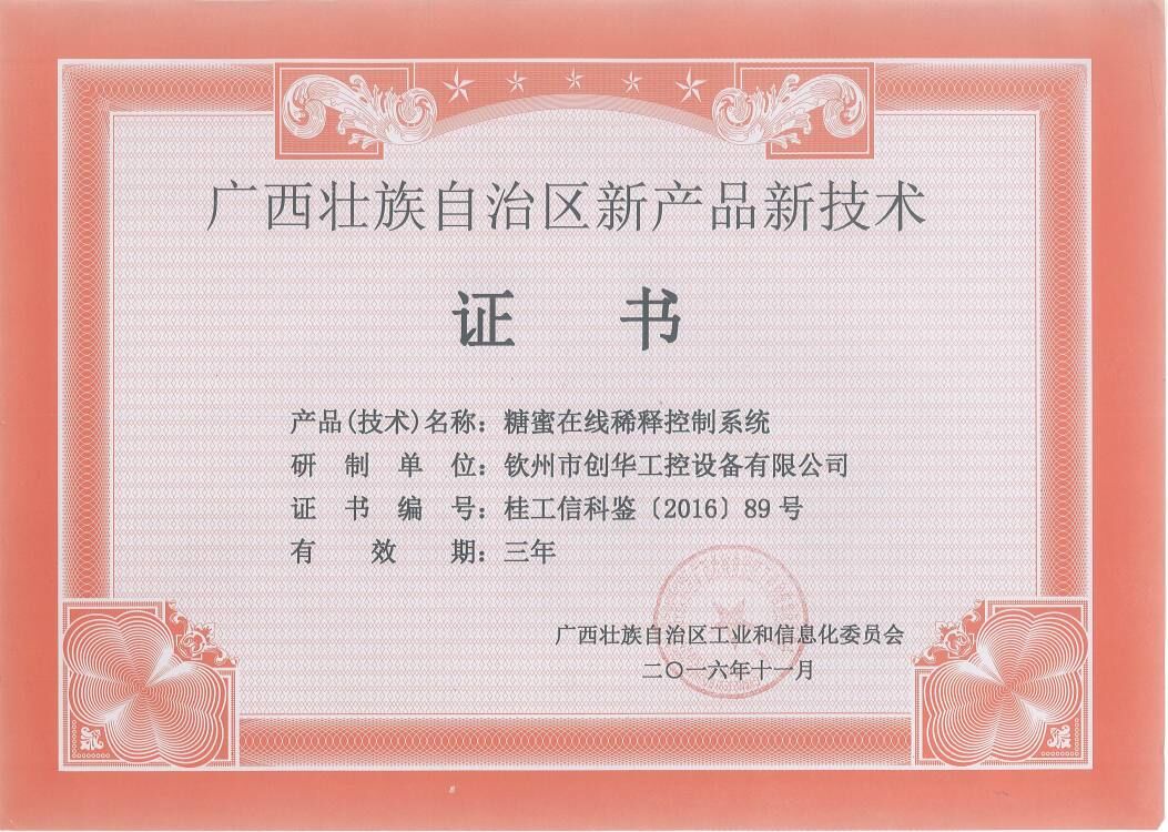 糖蜜在線稀釋控制系統(tǒng)新產品證書