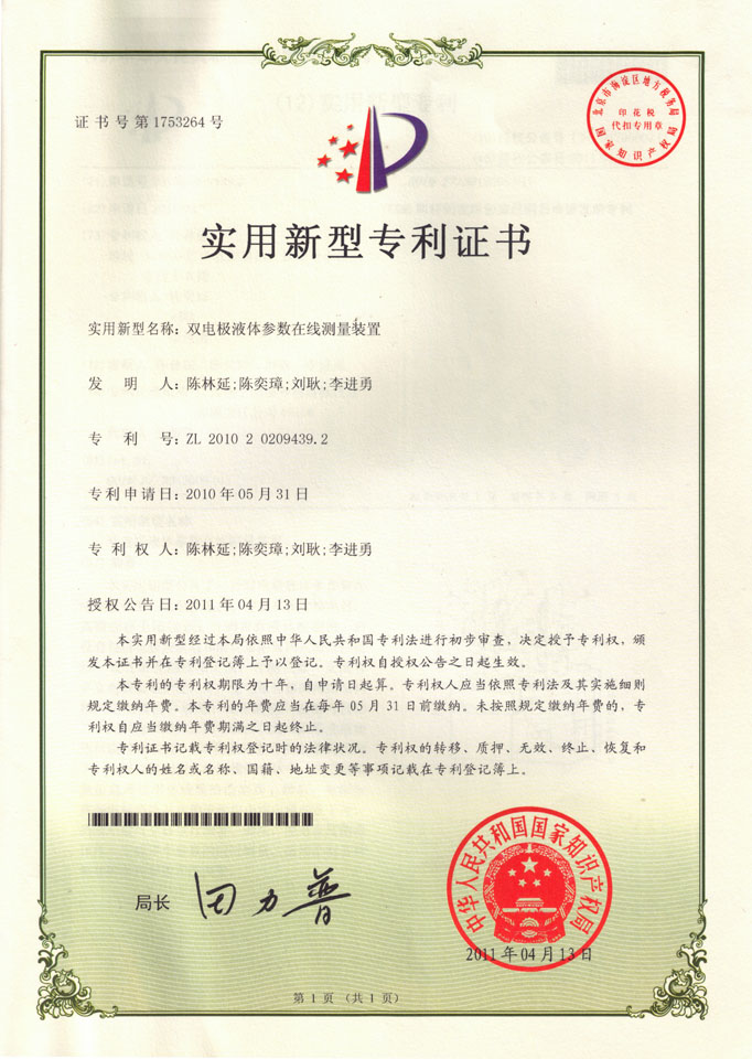 雙電極液體參數(shù)在線測量裝置(雙電極測量裝置),專利號(hào):ZL 2010 2 0209439.2