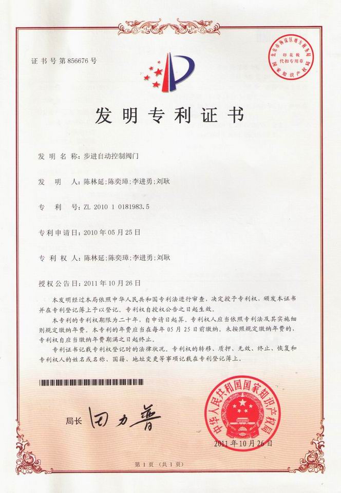 經(jīng)過(guò)公司研究人員兩年多的不懈努力,刻苦鉆研“步進(jìn)自動(dòng)控制閥門”研發(fā)成功,并于2010年5月25日向國(guó)家知識(shí)產(chǎn)權(quán)局申請(qǐng)專利保護(hù)。國(guó)家知識(shí)產(chǎn)權(quán)局經(jīng)過(guò)實(shí)質(zhì)性審查,于2011年10月26日授予專利權(quán)并頒發(fā)發(fā)明專利證書。