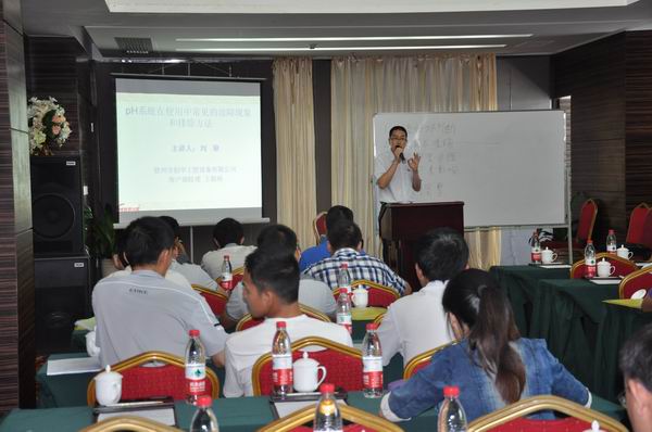 這次培訓(xùn)主要以創(chuàng)華工控pH自控系統(tǒng)系列產(chǎn)品為主,結(jié)合生產(chǎn)工藝,從理論到實(shí)際、系統(tǒng)結(jié)構(gòu)圖到實(shí)物,圍繞如何更好操作和維護(hù)設(shè)備展開講解,主要內(nèi)容有《玻璃電極的使用和維護(hù)》、《pH自控系統(tǒng)電路原理分析》、《pH自控系統(tǒng)故障分析和排除》等。培訓(xùn)還邀請了著名制糖專家—廣西大學(xué)食品工程學(xué)院周少基教授及糖廠pH自控系統(tǒng)第一人—華南理大學(xué)黃揚(yáng)明博士就《蔗汁澄清與控制》和《可靠性工程與產(chǎn)品研制》等方面內(nèi)容進(jìn)行了講解。