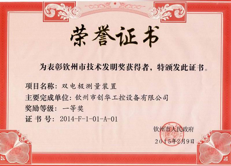 熱烈祝賀我司《雙電極測量裝置》喜獲2014年度欽州市技術(shù)發(fā)明一等獎(jiǎng)